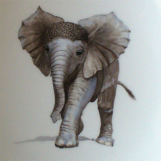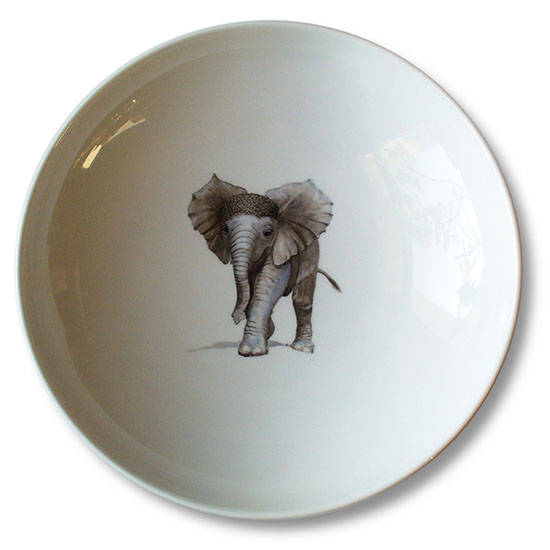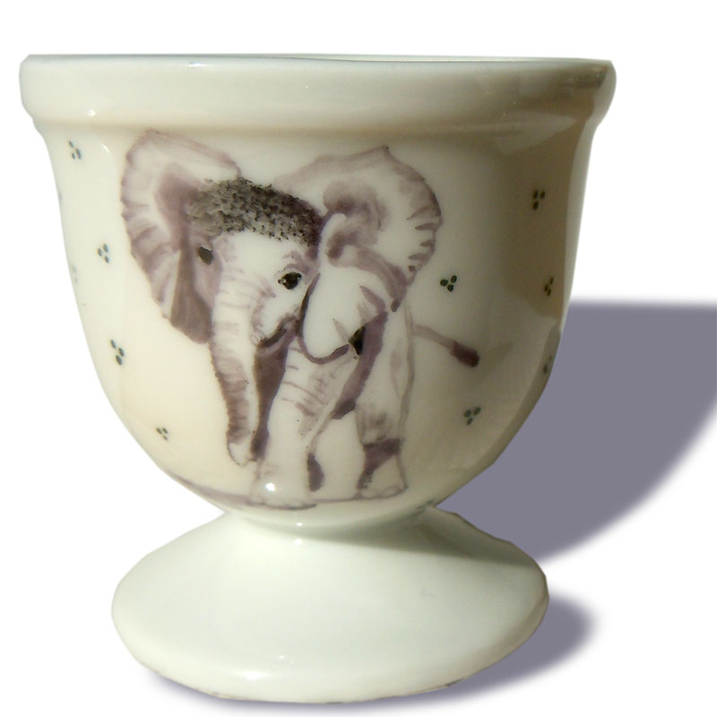 Ein Elefantenkind liebevoll detailliert gemalt auf Porzellan und noch einmal etwas vereinfacht dargestellt auf einem Eierbecher von Fürstenberg.