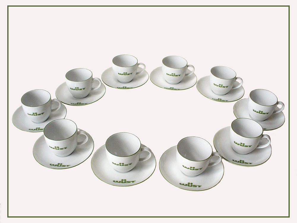 Logistik & Spedition“ auf Kaffeetassen in Grün.