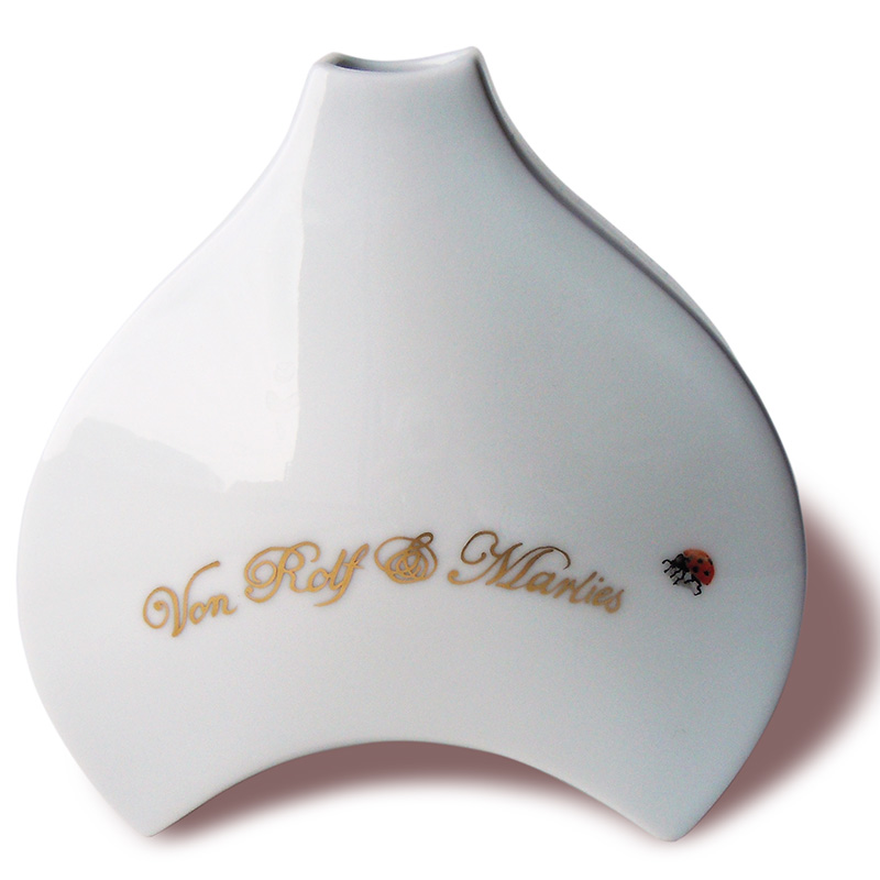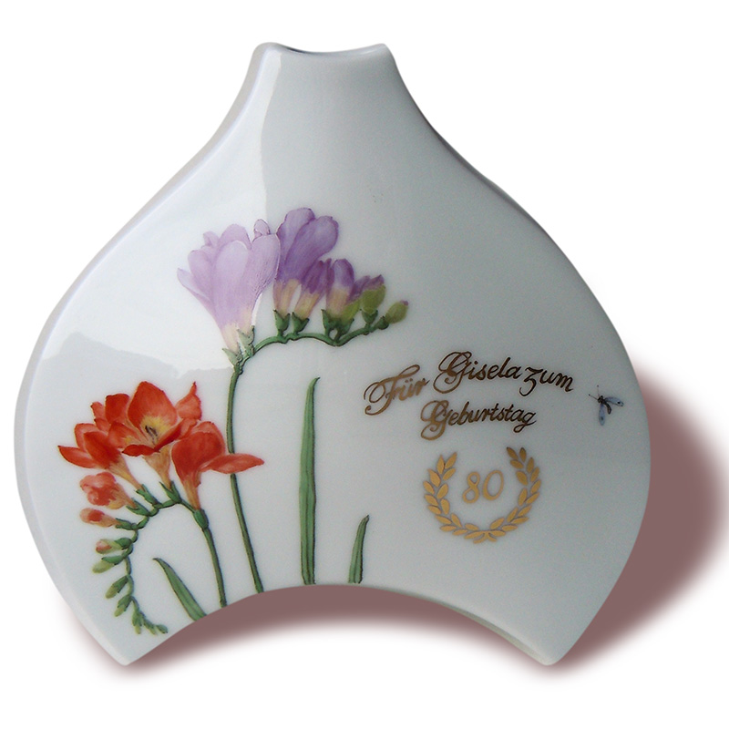 Freesien (Freesia) betören durch ihren süßen, subtilen Duft. Hier auf einer Vase der KPM mit goldenem Schriftzug zum 80. Geburtstag.