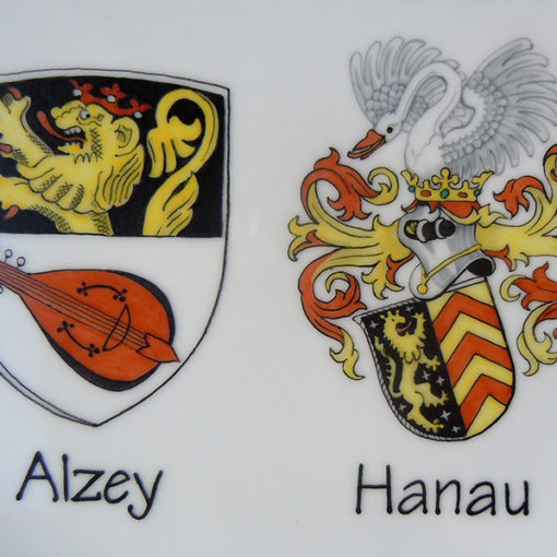 Veröffentlicht am 20. August 2019 Wappen Alzey und Hanau Wandteller | gebohrt | ø 26 cm Wappen zur Hochzeit auf einem Wandteller.