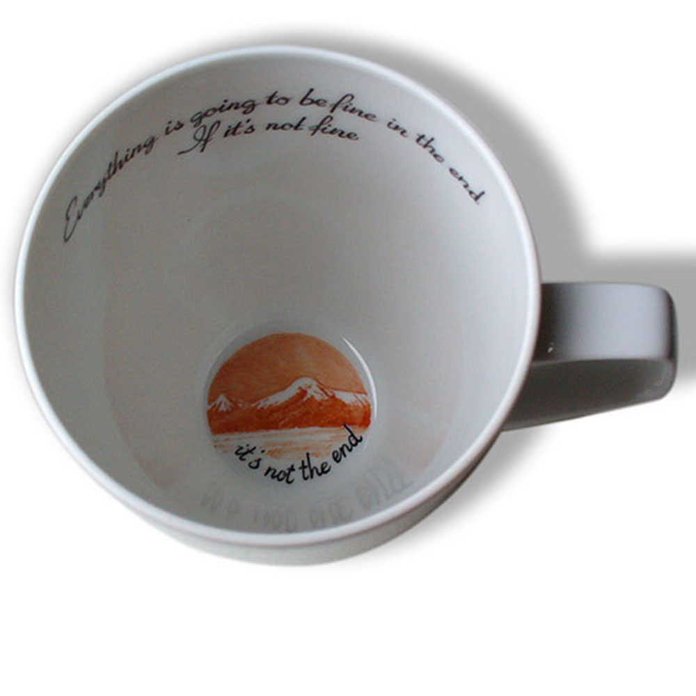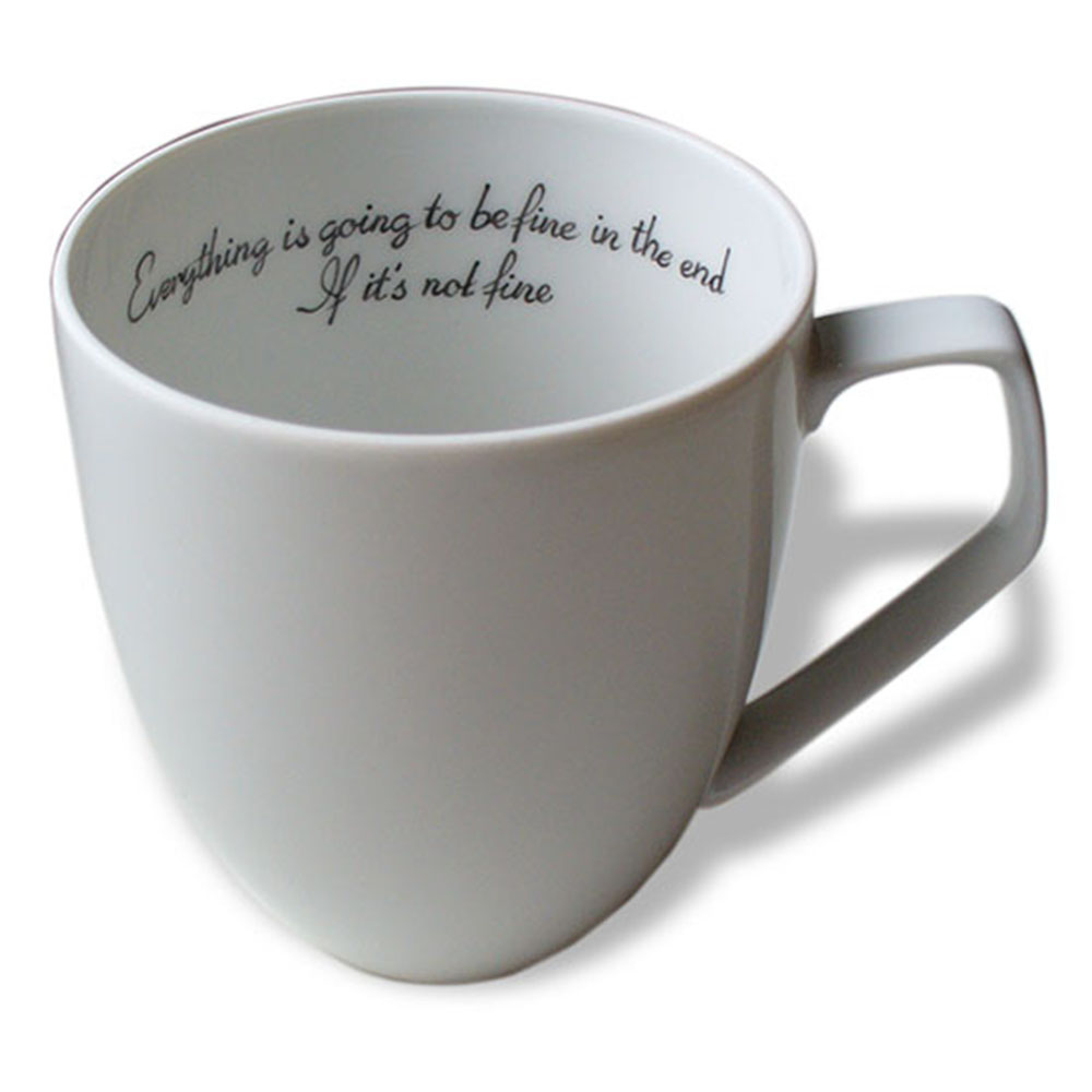 bzw. auf einer Teetasse mit feinem Schriftzug in Schwarz und einem Signet.