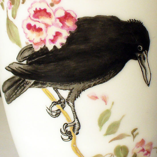 Rabe und Blüten, Stamm in Gold sowie auf der Rückseite eine Libelle und Käfer