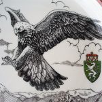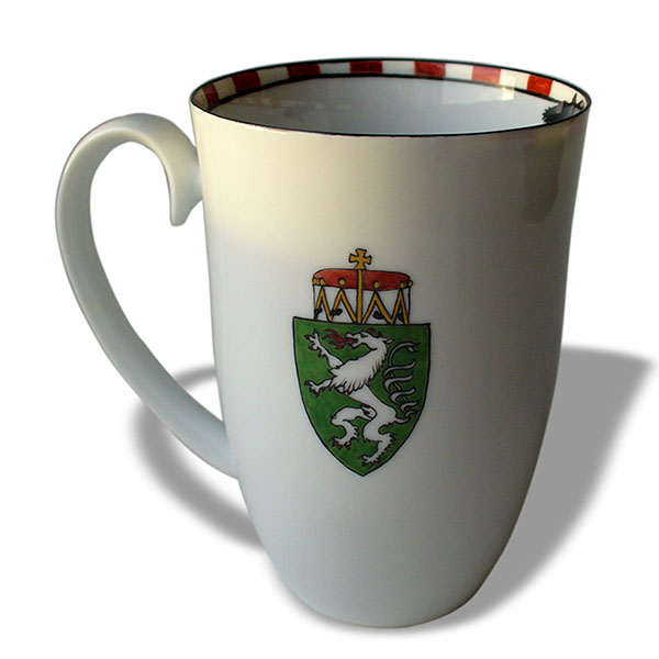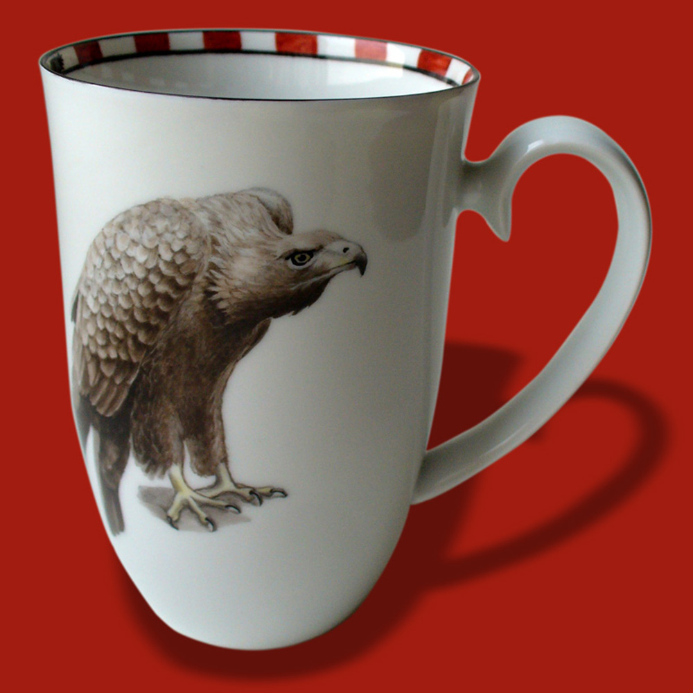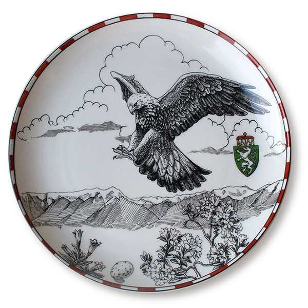 auf dem Teller eine Federzeichnung mit dem Steinadler, dem Wappen der Steiermark, Almrausch, Enzian und den Bergen von Trofaiach; auf der Tasse wurde der Steinadler malerisch dargestellt, auf der Rückseite wiederum das Wappen der Steiermark (mit Poliergold)