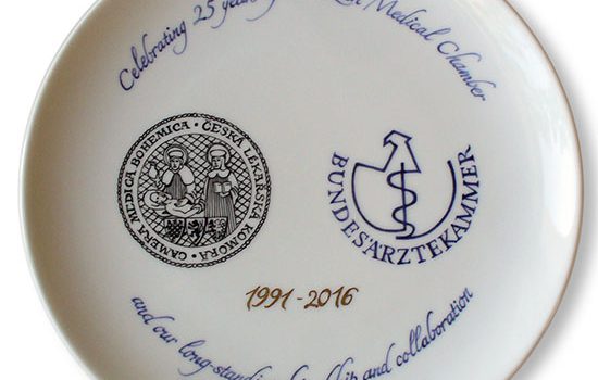 Signet Ärztekammer ø 21 cm Wandteller mit Goldrand Freundschaftsteller mit den Signets der deutschen Ärztekammer und deren Partnerin in Tschechien bzw. Polen