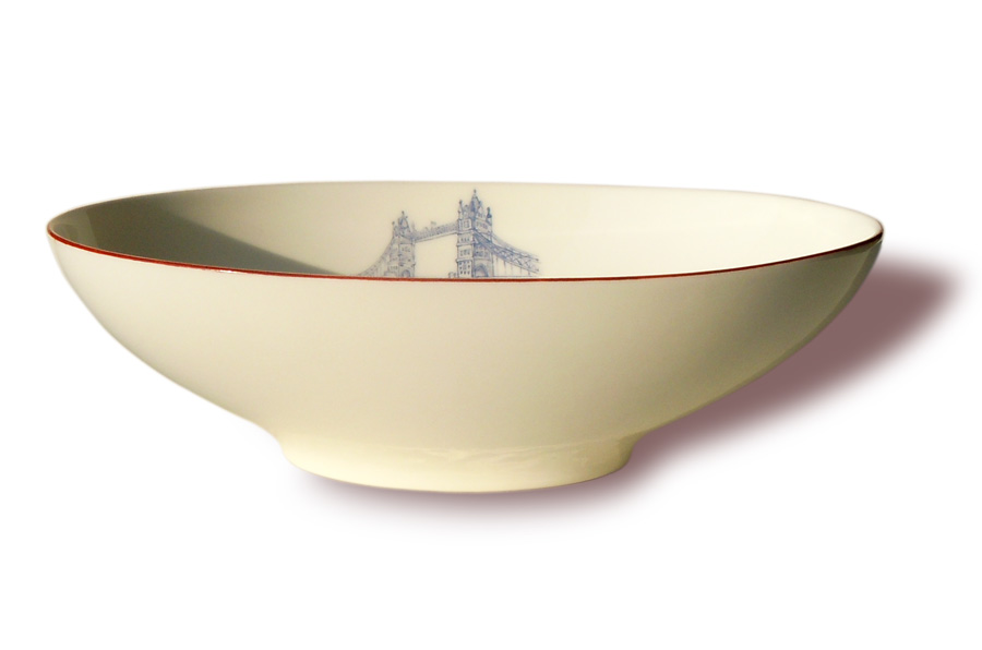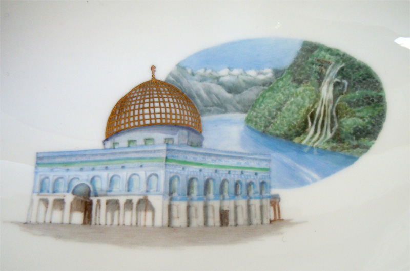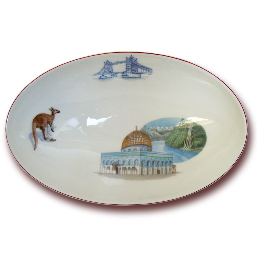 Urlaubserinnerungen in einer Schale eingefangen. Mittels Porzellanmalerei. Hier auf einer wunderschönen Schale in ovaler Form. Die Kuppel des Felsendoms wurde in Gold ausgeführt.